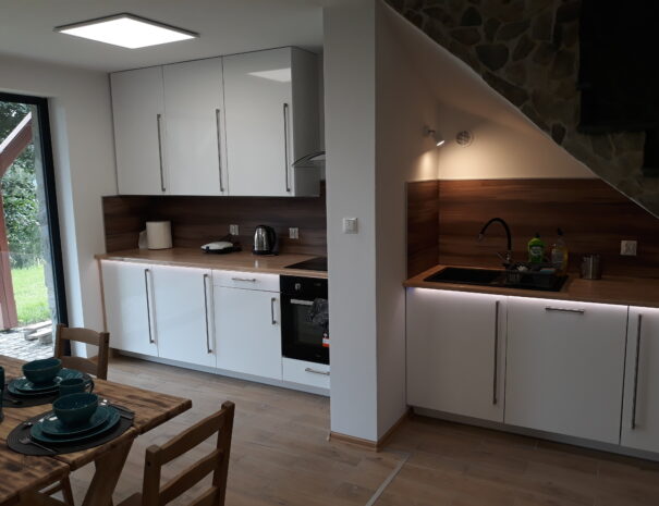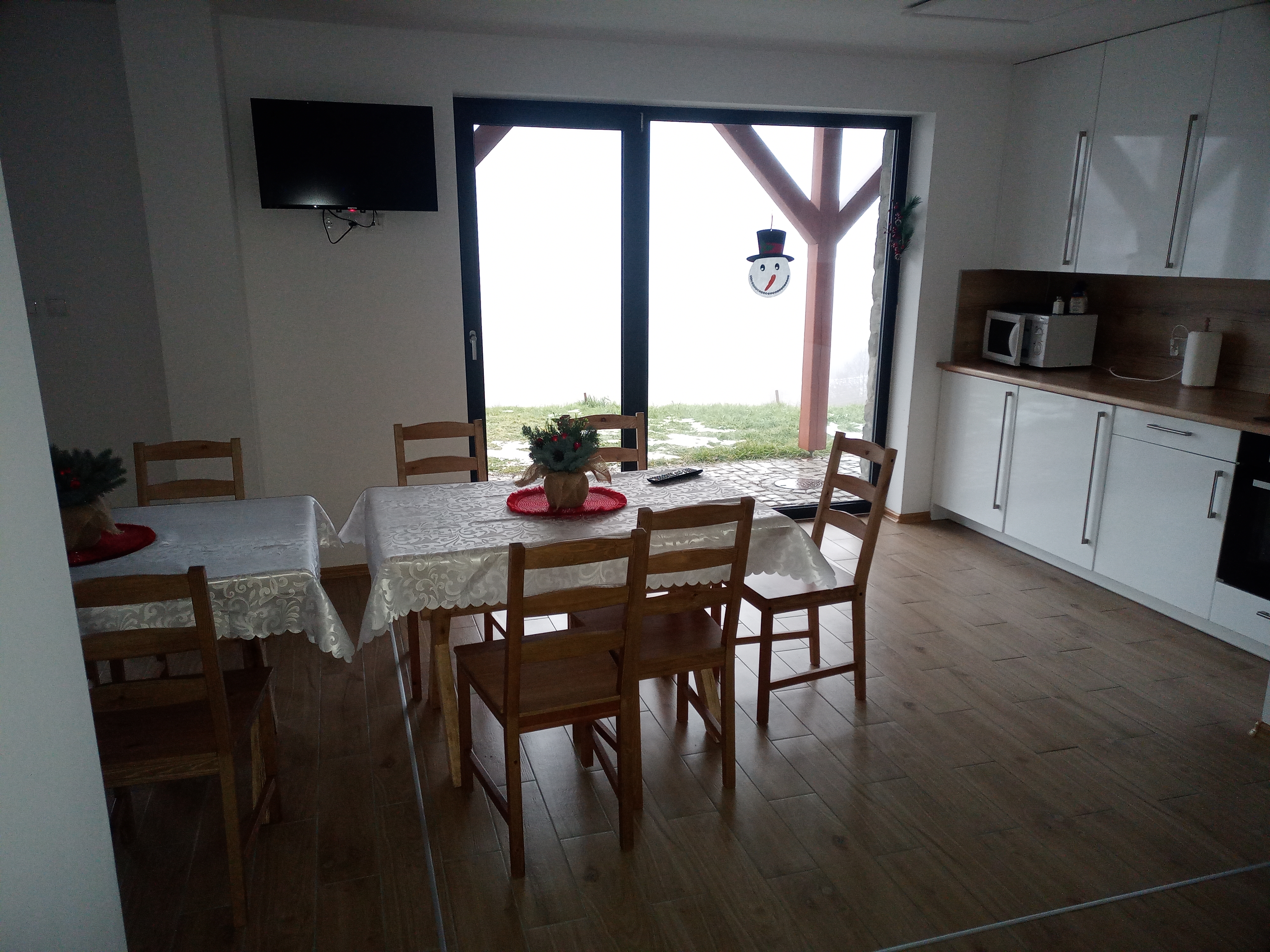 W pełni wyposażona duża kuchnia z jadalnią. Duże przeszklenia i wyjście na patio pozwoli delektować się nie tylko posiłkiem na świeżym powietrzu, ale tez i pięknymi widokami.